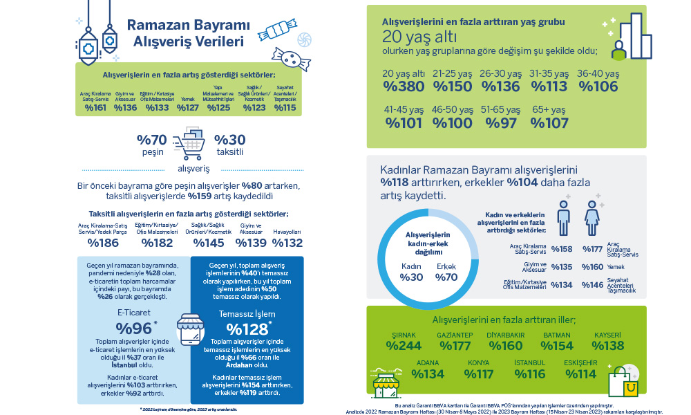 Garanti BBVA Ödeme Sistemleri (GÖSAŞ), Ramazan Bayramı kapsamında, Garanti BBVA kartları ile Garanti BBVA POS’larından yapılan işlemler üzerinden gerçekleştirdiği araştırma verilerini paylaştı. 2022 ve 2023 yıllarının Bayram haftasını kapsayan araştırma, yıldan yıla alışverişlerin en fazla hangi sektörlerde artış gösterdiğini açıklıyor.