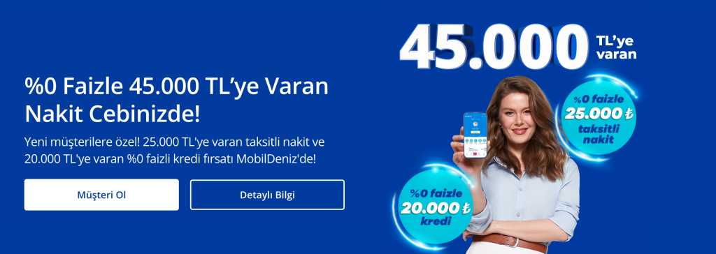 MobilDeniz’den yeni müşteri olanlara özel, %0 faizli 25.000 TL’ye varan Taksitli Nakit ve %0 faizli 20.000 TL’ye varan kredi.