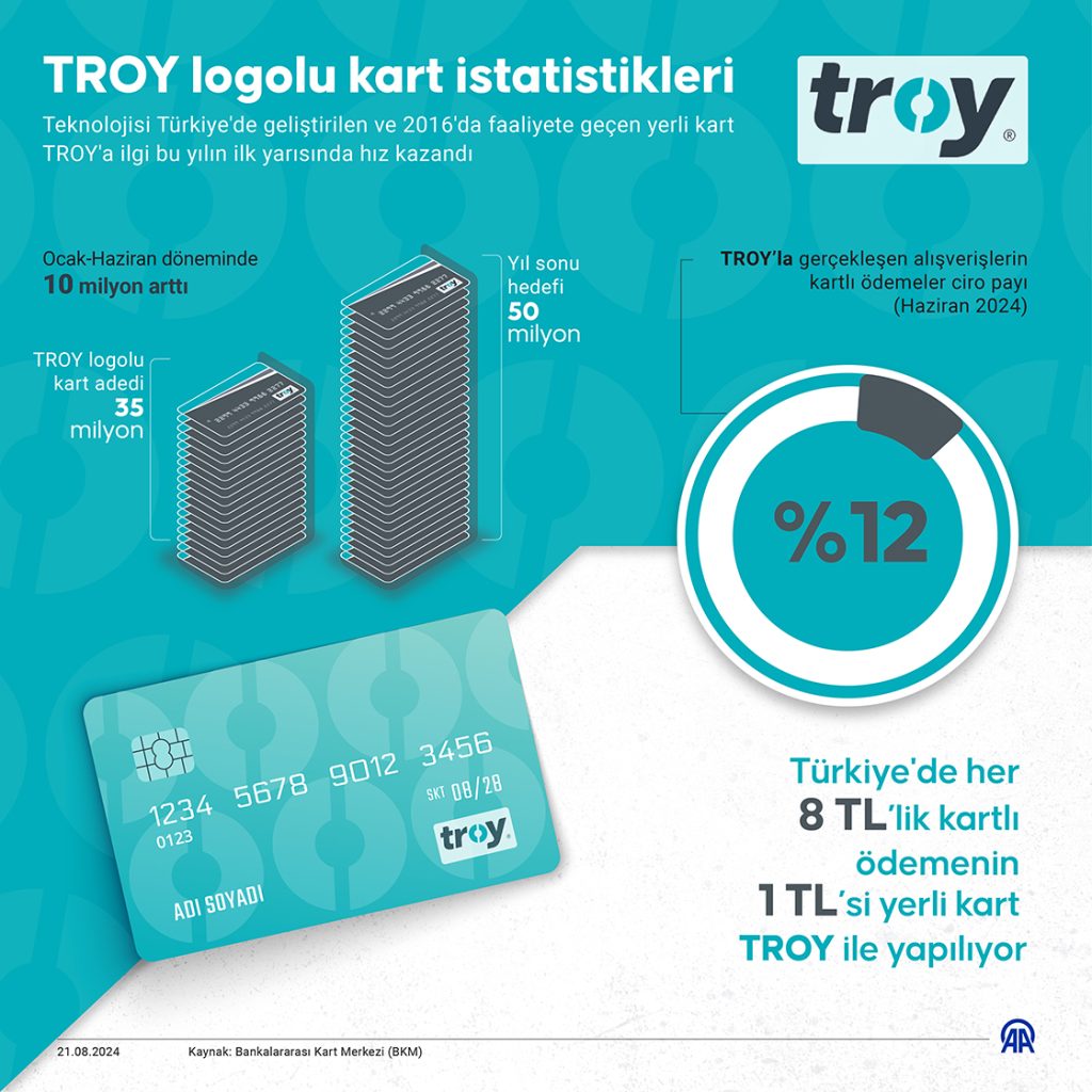 ANADOLU AJANSI’nın haberine göre: 2016’da faaliyete geçen yerli kart TROY’a ilgi bu yılın ilk yarısında hız kazandı. TROY’un kullanımı ve kart sayısı yılın ilk 6 ayında önemli bir ivme kaydetti.
